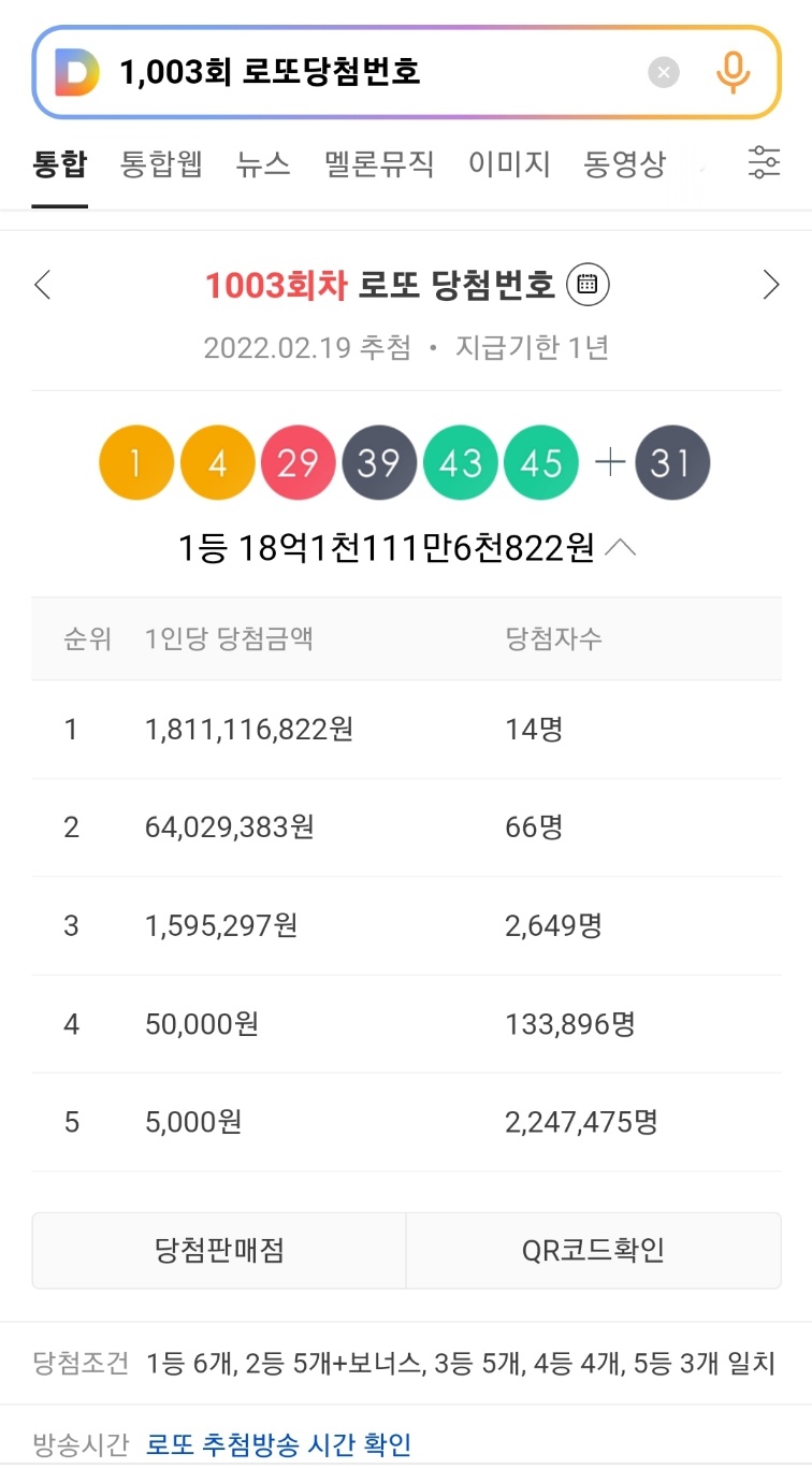 로또 당첨조건 1등 6개, 2등 5개+보너스 번호, 3등 5개, 4등 4개, 5등 3개 일치해야 합니다. 1등 6개 번호 일치 총 당첨금 중 4등, 5등 금액을 제외한 금액의 75% 2등 5개 번호 일치+ 보너스 번호일치 총