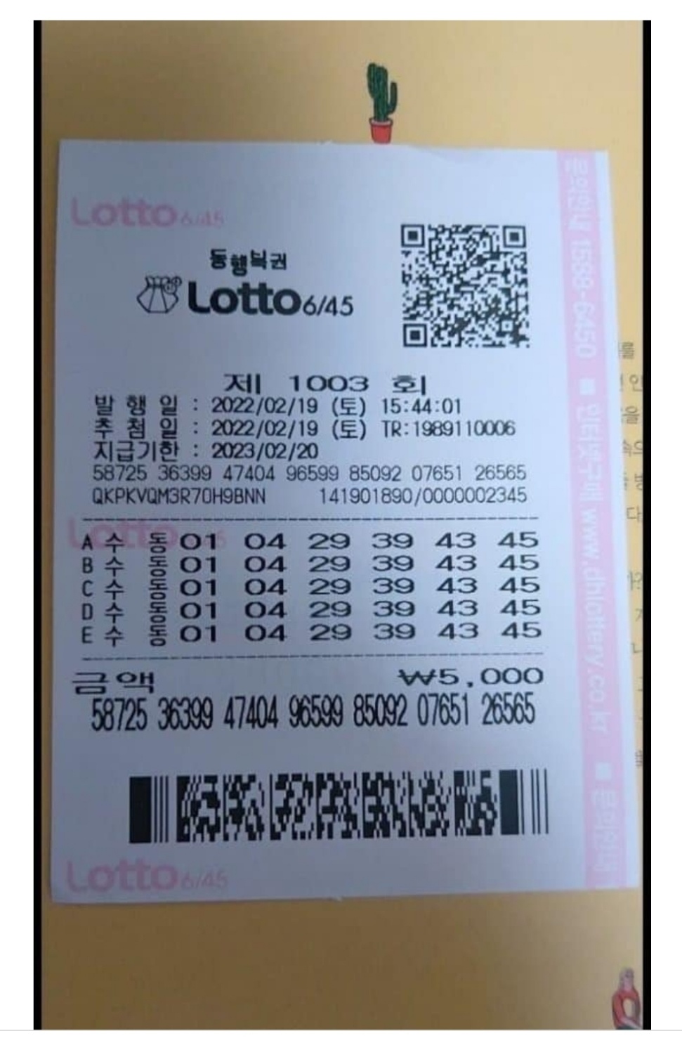 같은 번호 5개를 연달아 구입해서 한 번에 당첨된 일이 있었습니다.
