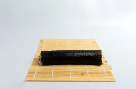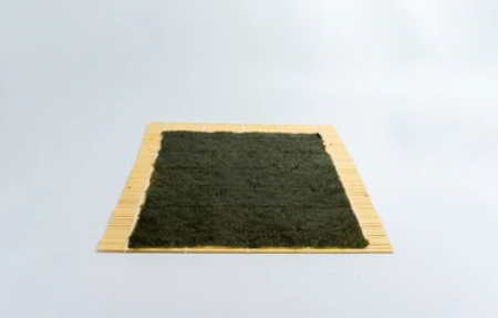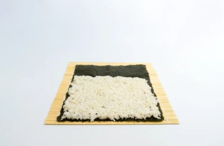 Lay a bamboo rolling mat on a clean surface and place a sheet of plastic wrap over it. Position a sheet of toasted seaweed (nori) on top of the plastic wrap.