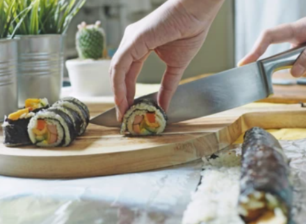 Once your kimbap roll is complete, give it a gentle squeeze to ensure a firm shape. With a sharp, damp knife, slice the roll into bite-sized pieces. Wipe the knife clean between cuts to achieve neat slices.